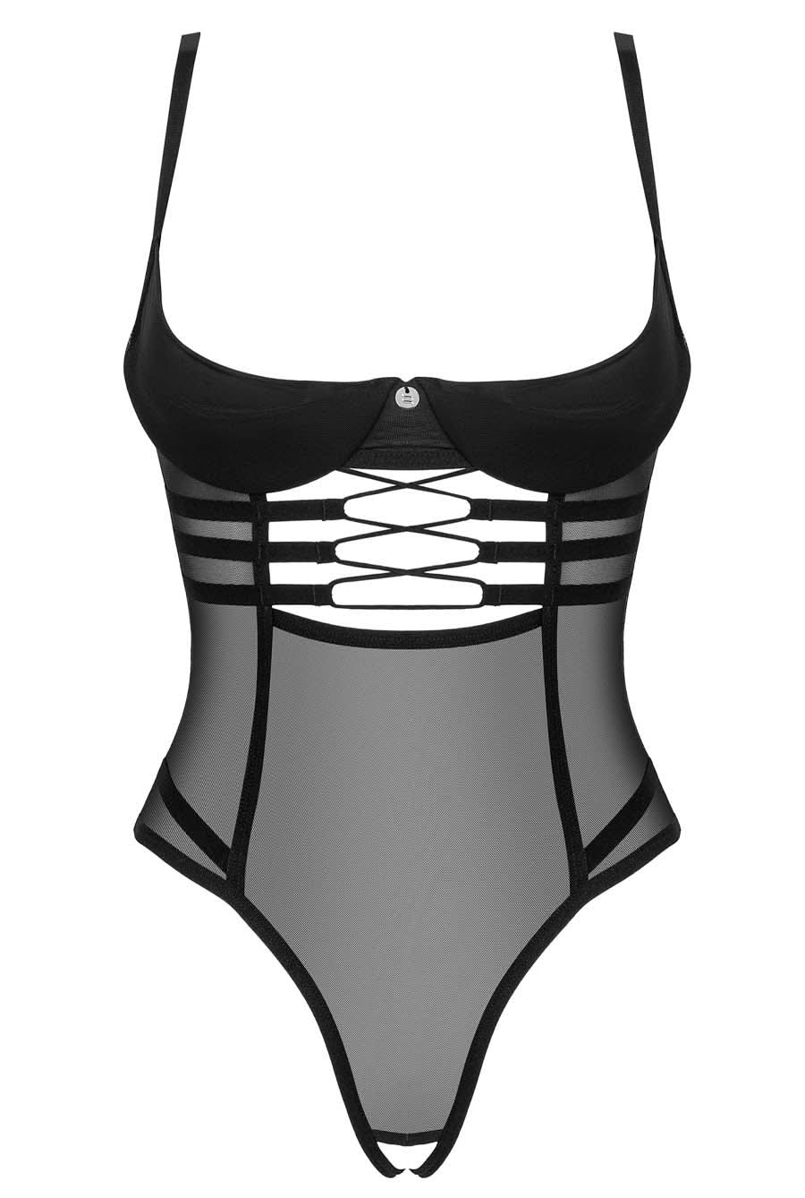 Explore kinky lingerie of Sultry black mesh bodysuit with soft booster underwire cups, strappy cut-away back, and open crotch for an erotic allure.