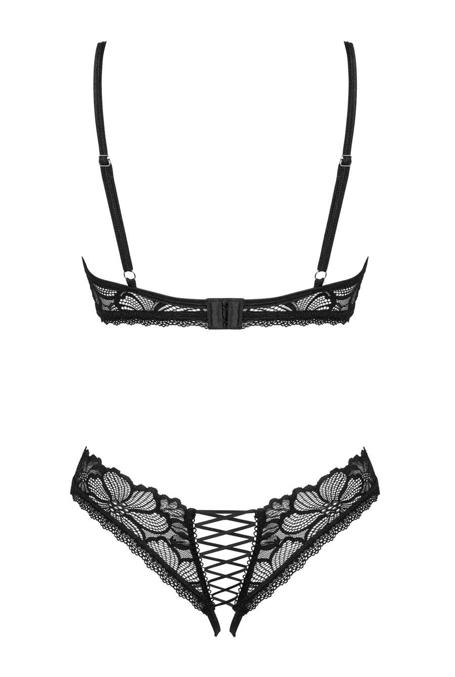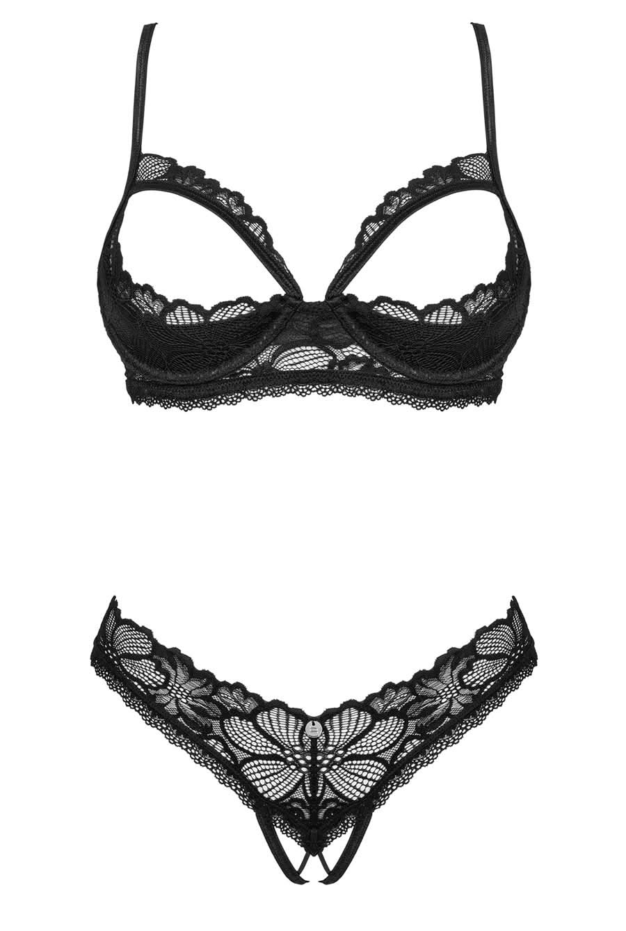 Dare to be bare in this erotic demi cup bra and crotchless G-string set. Style features black ace and micro knit in an open cup underwire bra and open crotch G-string luxury lingerie set.