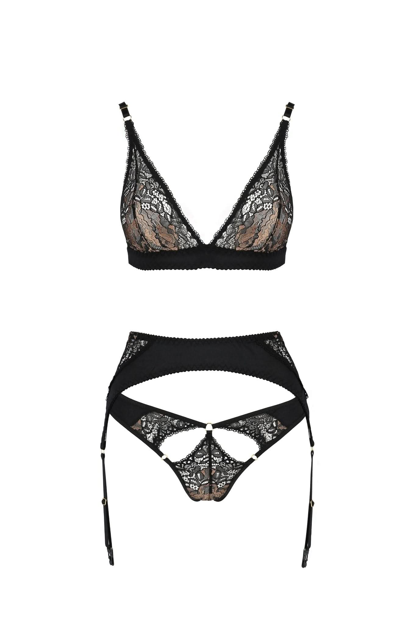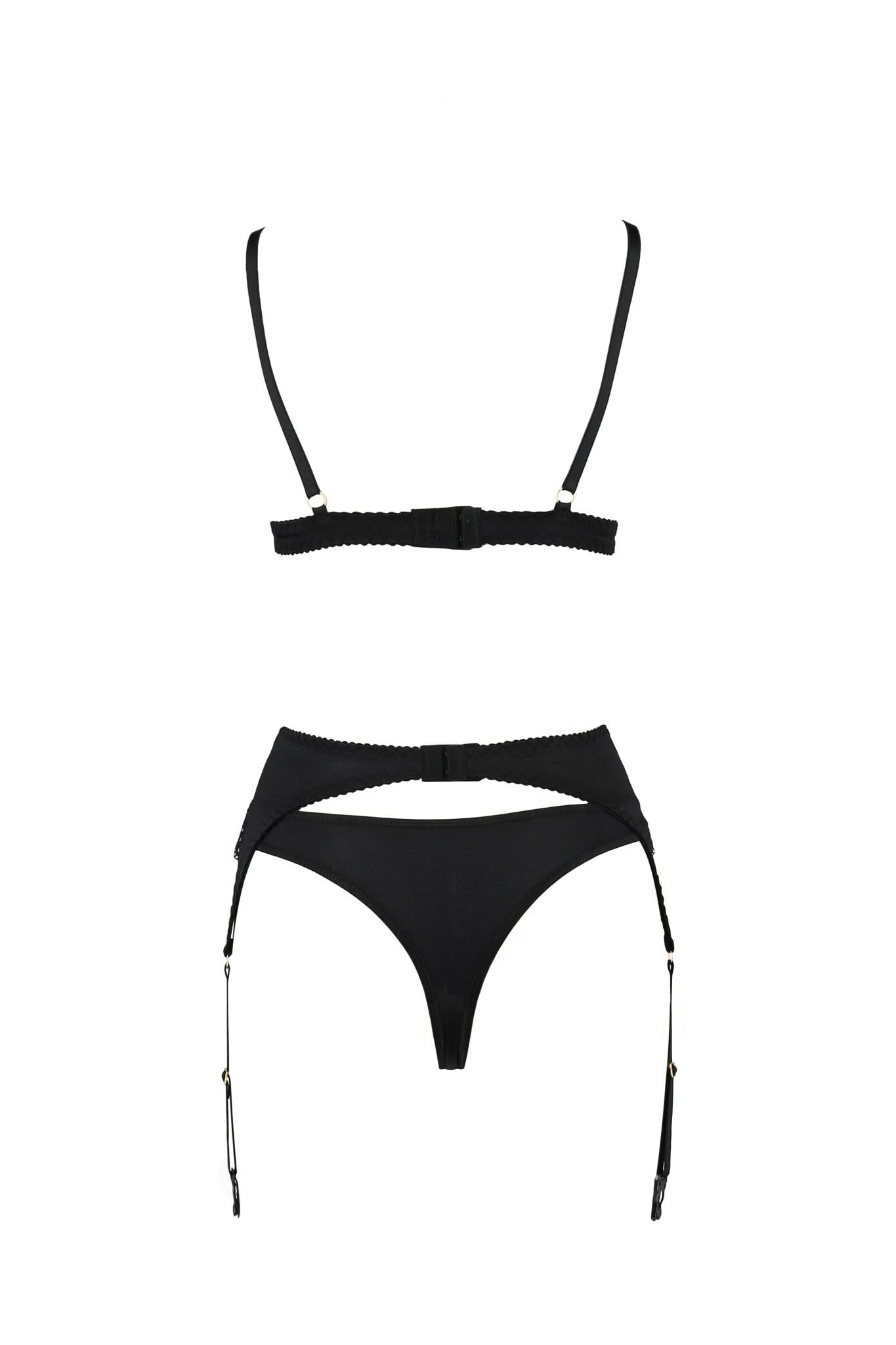 Discover an alluring blend of sophistication and allure with this exquisite 3-piece lingerie set. Crafted in Europe, this distinctive ensemble features a captivating combination of black and gold lace adorned with satin trims, making it an essential addition to any intimate wardrobe.