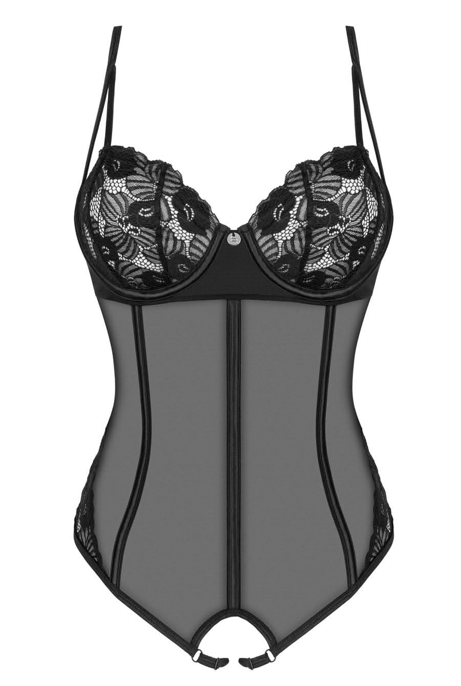 Black Mesh & Lace Crotchless Teddy Bodysuit