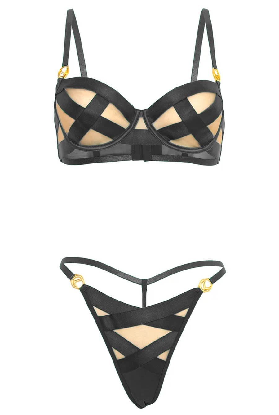 Black Strappy Satin Bra & Gstring Lingerie Set
