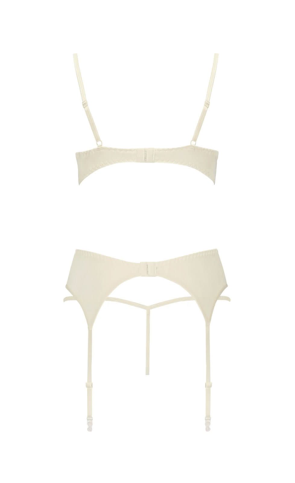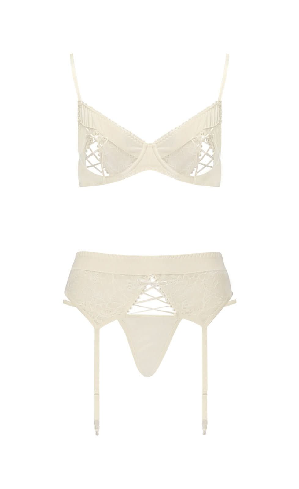 Elevate your intimate apparel collection with this enchanting three-piece lingerie set, featuring delicate lace and soft microknit materials. With charming ribbon ties, a stylish garter belt, and a coordinating G-string, this set is an ideal choice for summer getaways or as a delightful addition to bridal attire. Combining luxury with allure, this handcrafted European design offers a unique twist that is sure to captivate.