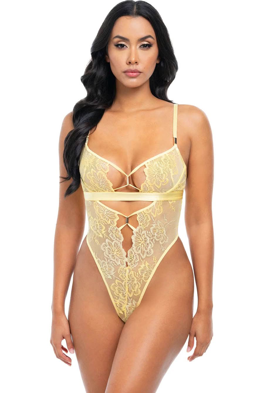 Prepare to embrace the charm of the our delicate yellow Lace Teddy, a captivating piece that effortlessly combines sophistication with a playful edge. This exquisite garment, adorned with intricate embroidered lace and stylish strappy cut-outs, is designed to elevate your confidence and make you feel extraordinary.