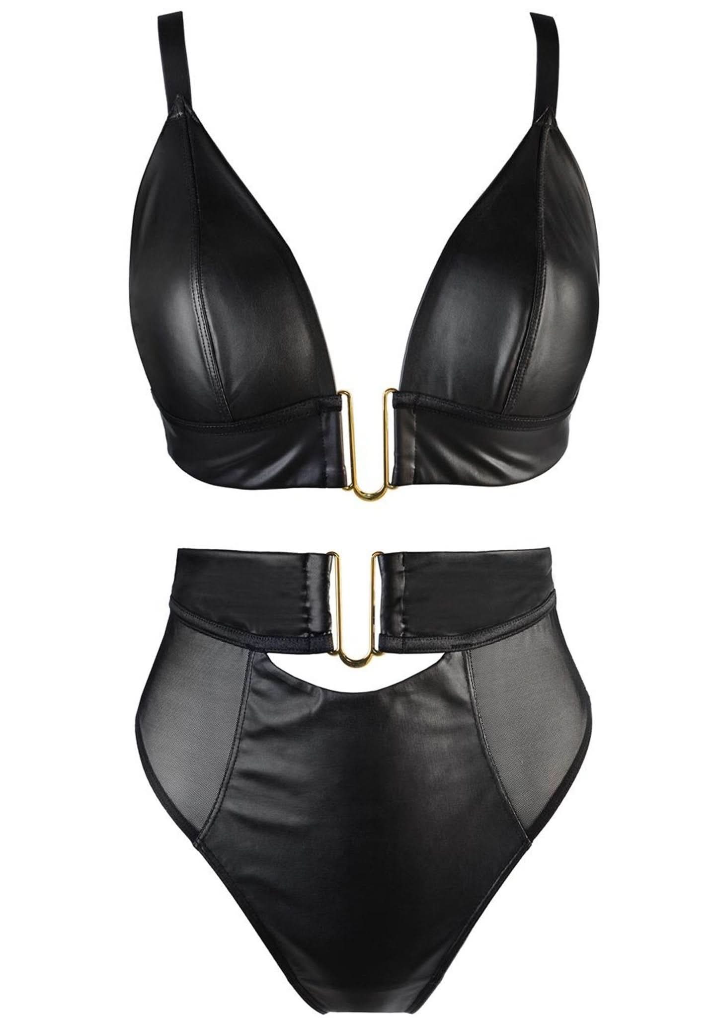 Discover a captivating lingerie set that seamlessly blends sophistication with allure. This exquisite ensemble features a plunging front design crafted from faux leather, accentuated with elegant gold charm buckles. The piece includes an underwire plunge longline bra, made from a combination of luxurious faux leather and delicate sheer mesh, paired perfectly with a matching high-waisted panty, all handmade in Europe.
