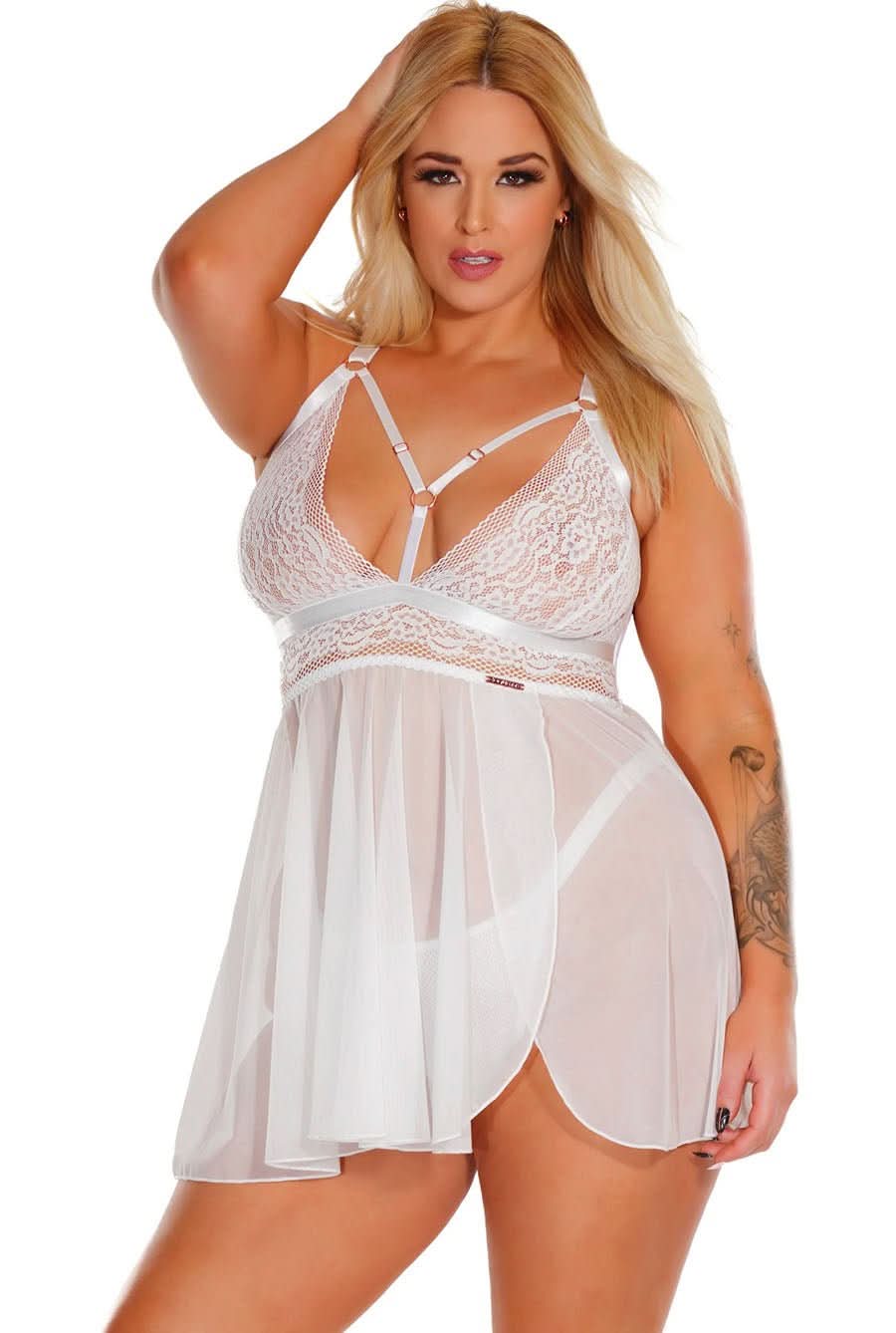 Strappy White Lace Sheer Babydoll Lingerie Set
