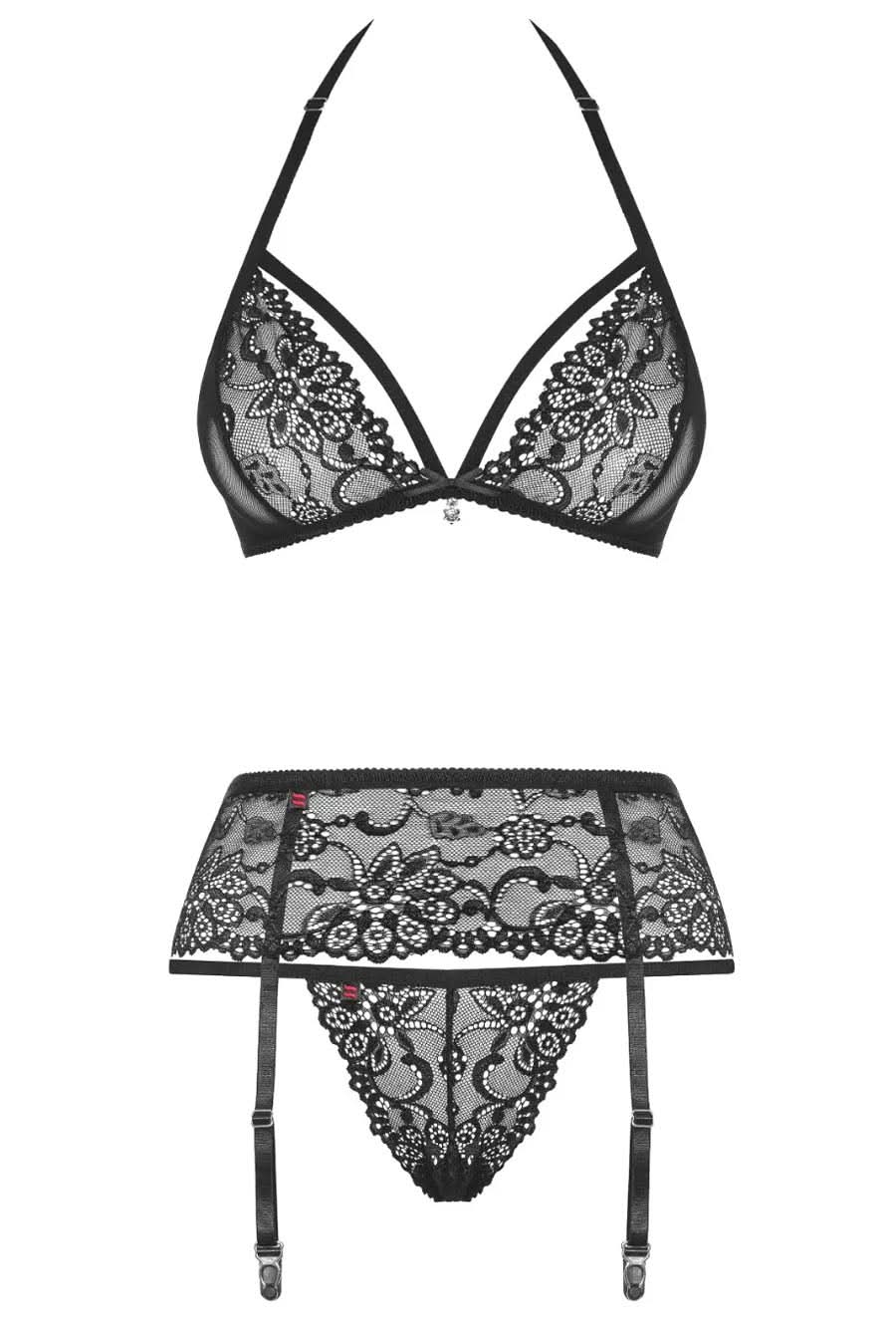 Luxury European lingerie to set the pace in desire, this lace 3 piece black lace strappy bra set with gsting and suspender belt is a classy lingerie set to add to your collection.