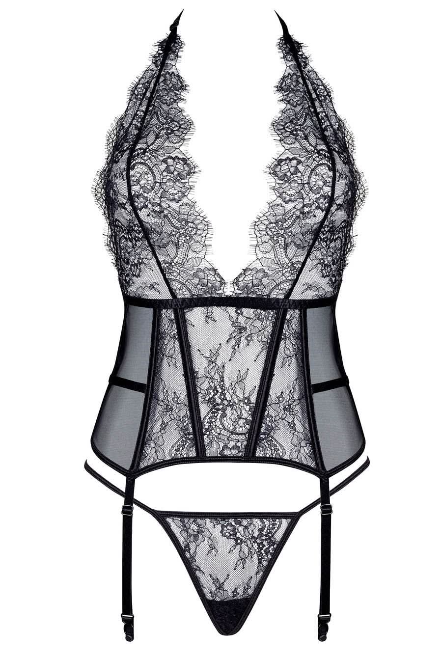 Eyelash Lace & Mesh Black Bustier Lingerie Set
