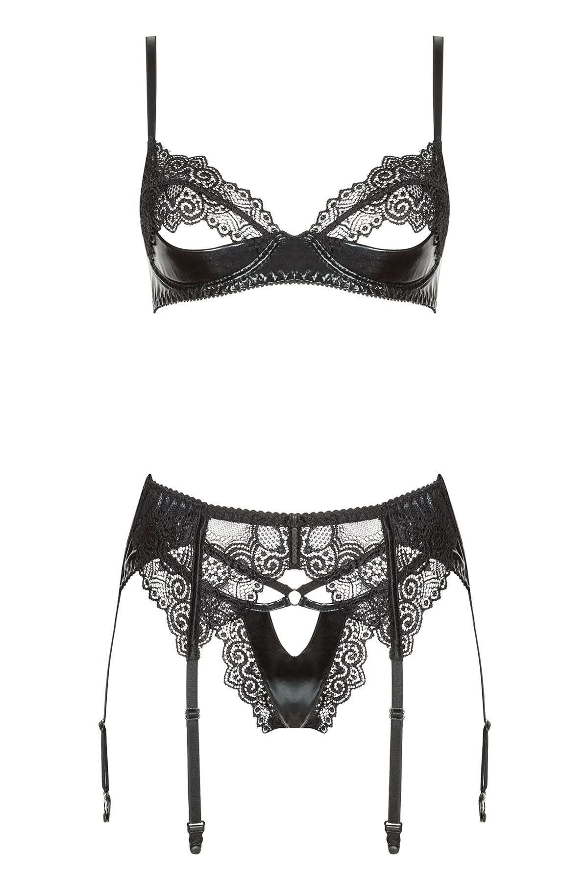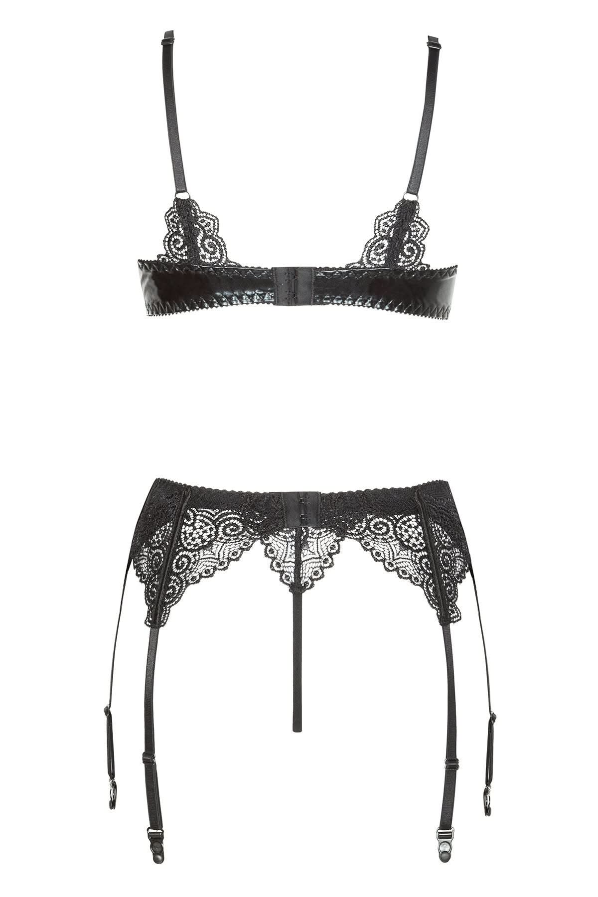 Hot and sexy and set to thrill, this wet look faux leather and lace 3 piece set is a must have for faux leather lovers.