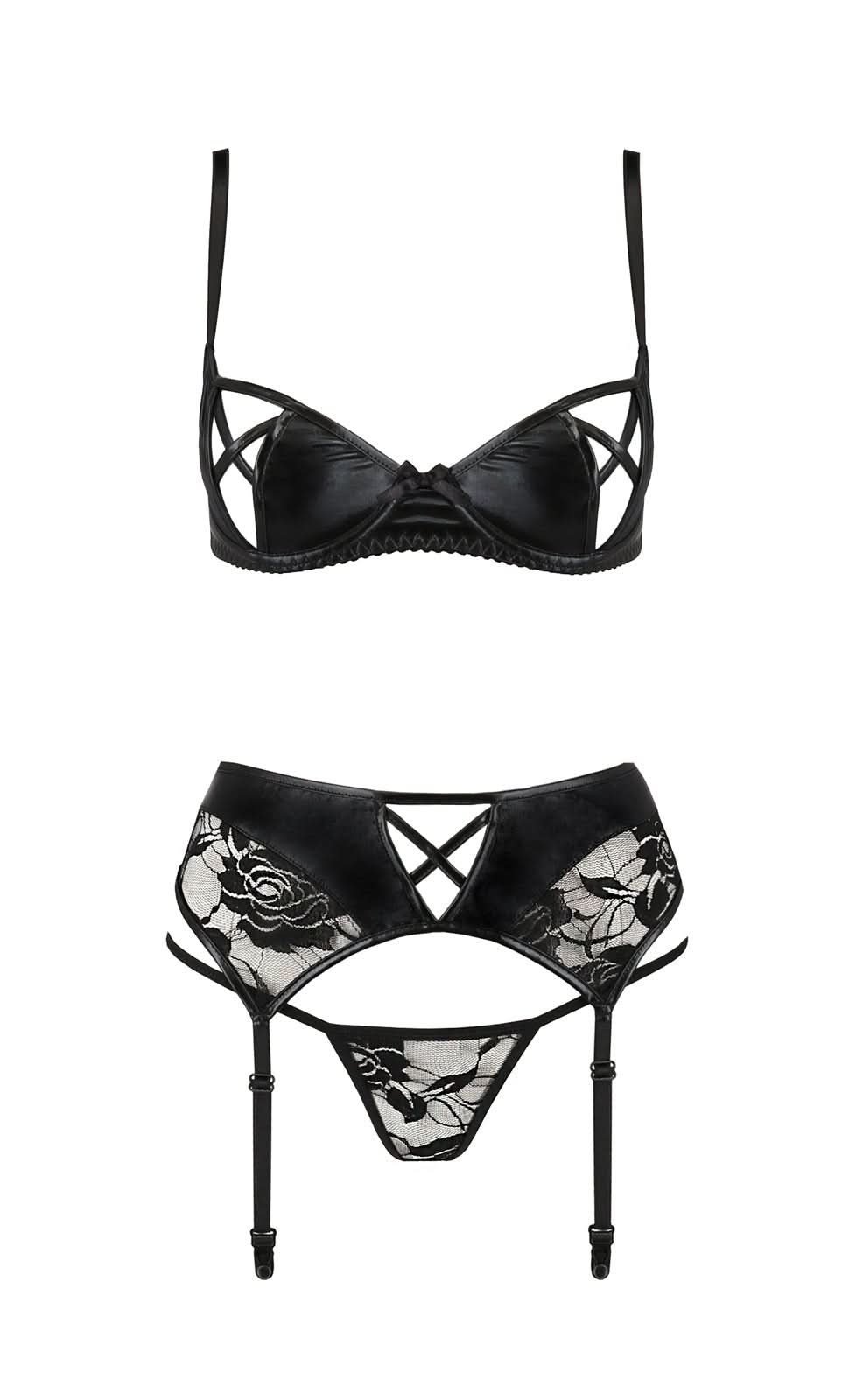 Elevate your lingerie collection this season with our striking black faux leather and lace three-piece set. Designed for those who appreciate the bold aesthetics of leather, this unique ensemble showcases an erotic flair that is exclusively crafted in Europe.