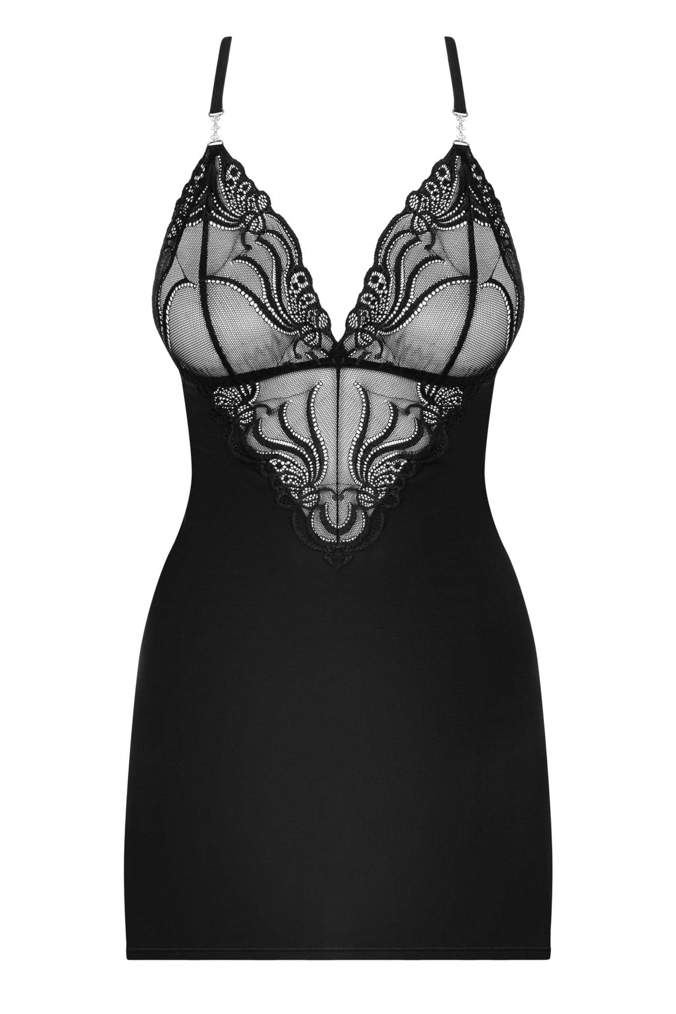 Discover a stunning addition to your intimate wardrobe with this exquisite European lingerie piece. Crafted from delicate black lace and luxurious micro knit fabric, this chemise strikes the perfect balance between sophistication and sensuality. The highlight of this design is its striking rhinestone shoulder embellishment, adding a touch of glamour to your ensemble.