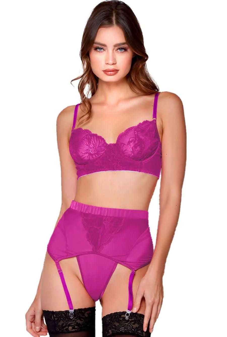 Experience the charm and elegance of this stunning three-piece corset bra set, crafted in a vibrant fuchsia hue. Combining micro knit and delicate lace, this ensemble features soft cups enhanced with underwire support, offering both style and comfort. Designed in a longline bra silhouette, it is a fashionable choice for those who appreciate bold colors in their lingerie collection.