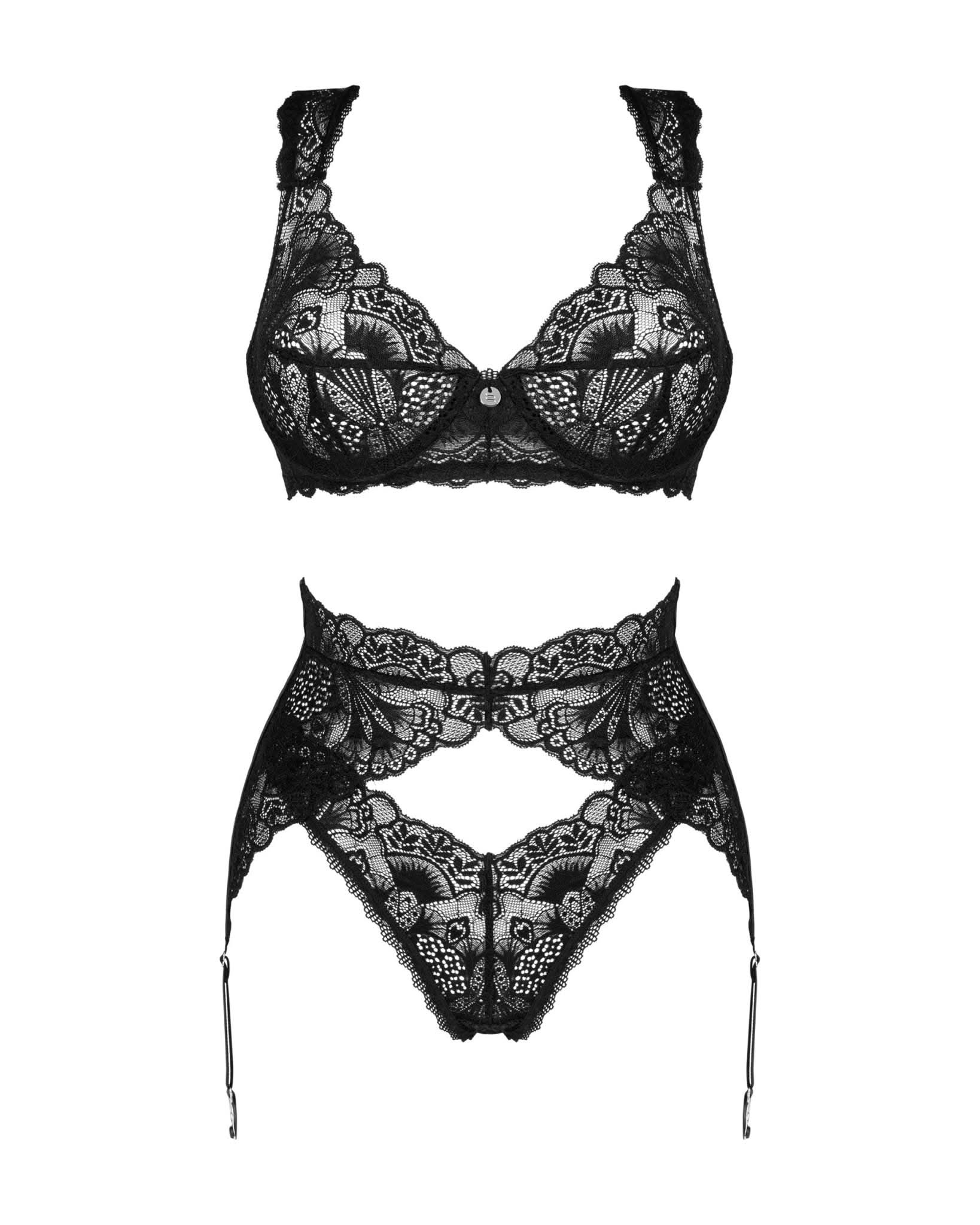 Elevate your lingerie collection with an exquisite black lace 3-piece ensemble that embodies sophistication and allure. This stunning set includes a beautifully crafted bra, a matching G-string, and showcases a delicate design that is both stylish and comfortable.
