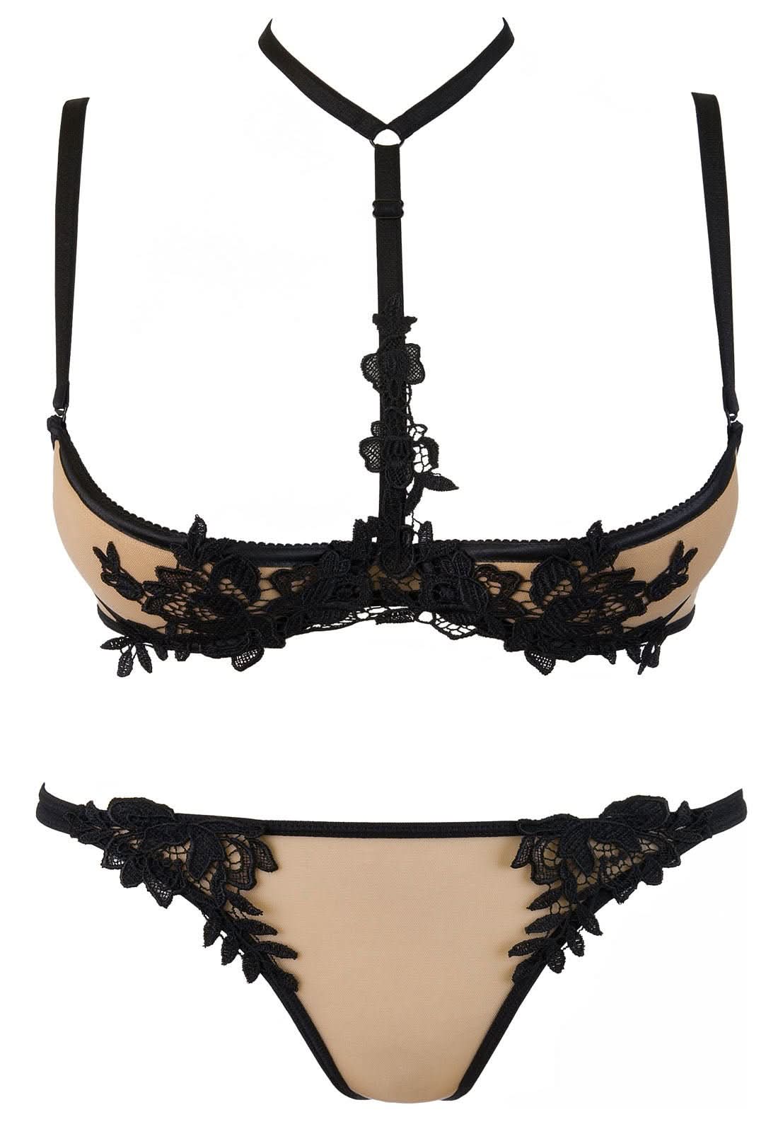 Discover a captivating lingerie set that beautifully combines sophistication and allure. This exquisite ensemble, crafted in a striking black and nude palette, offers a touch of class with its luxurious appliqué accents. The standout piece, a padded underwire quarter-cup bra, is designed for those who appreciate both comfort and sensuality. Accompanied by a matching G-string, this unique creation showcases a daring design that has been meticulously handmade in Europe.