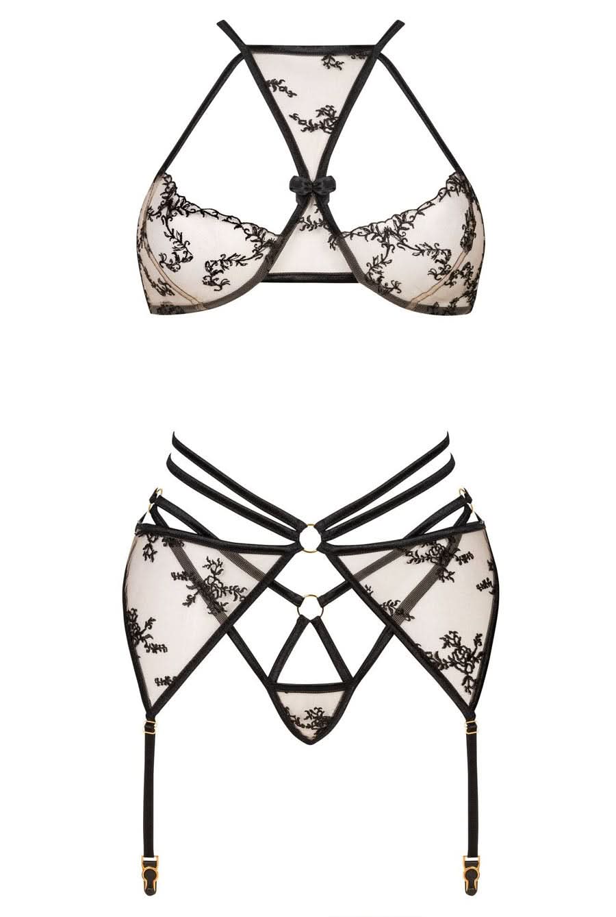 Discover the elegance of a contemporary lingerie ensemble that combines exquisite black lace with delicate sheer nude tulle. This luxurious bra and garter belt set is designed for those who appreciate a sophisticated, transparent aesthetic, featuring intricate lace cups that offer a subtle allure along with soft satin straps for added comfort.