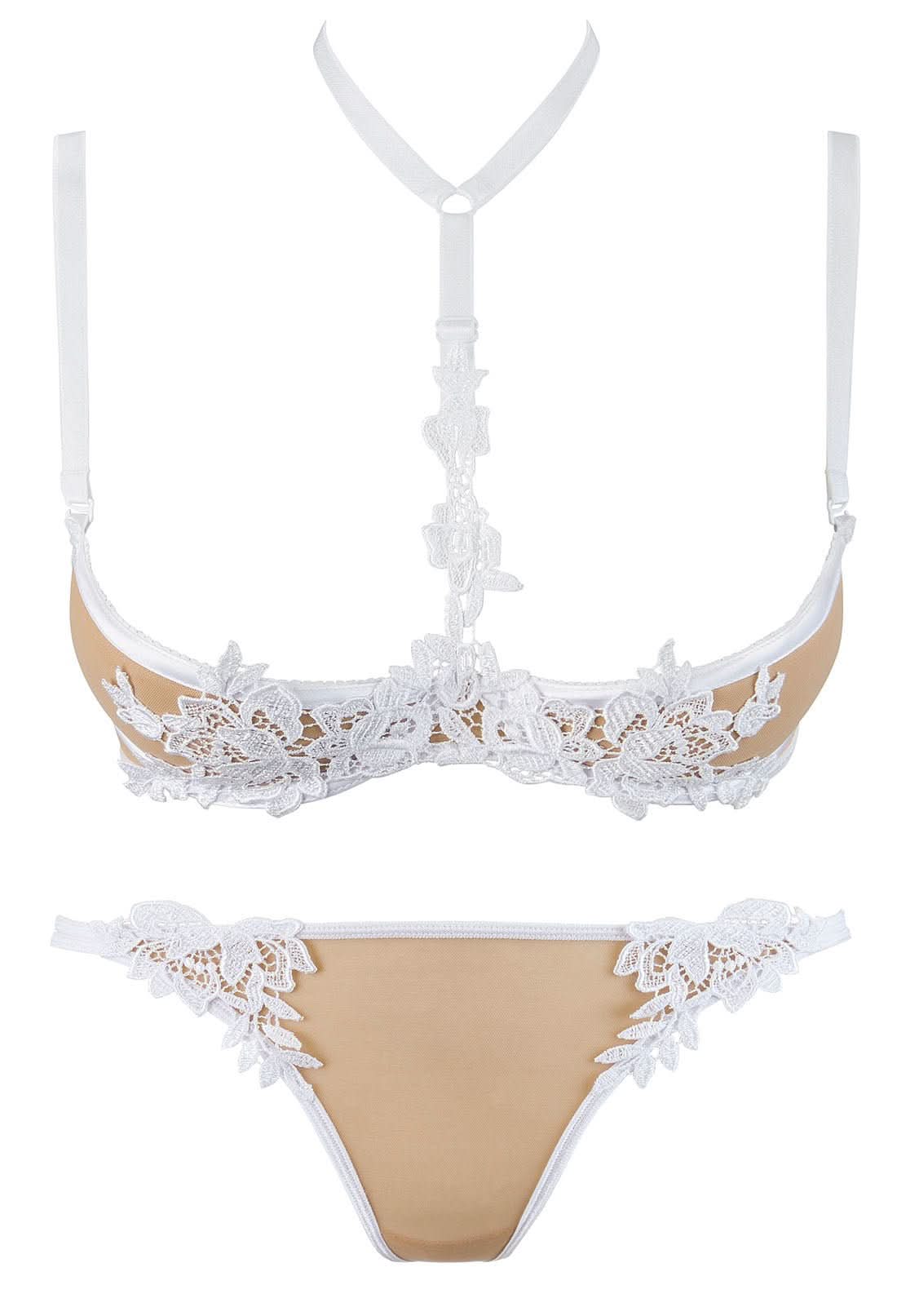 Introducing a stunning lingerie set that embodies sophistication and charm. This exquisite ensemble, available in a delicate combination of white and nude tones, is a perfect addition to any collection. With luxurious appliqué details, this set features an enticing peek-a-boo padded booster bra designed with an underwire quarter cup, offering both support and a touch of allure.