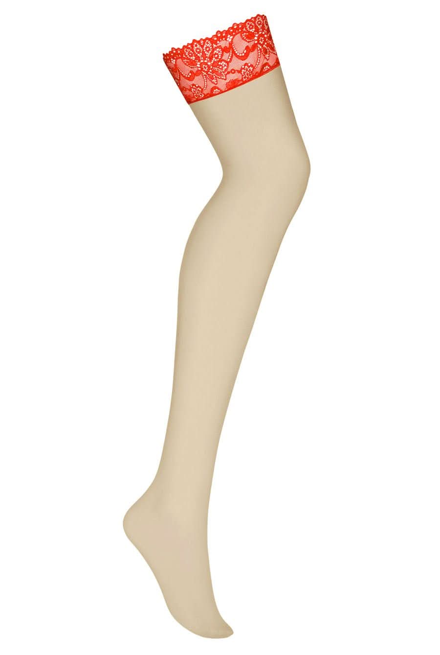 Sexy red lace and nude sheer garter belt stockings with beautiful wide lace tops. Put the finishing touches on your lingerie, matches back with a corresponding bra set and bustier lingerie set.