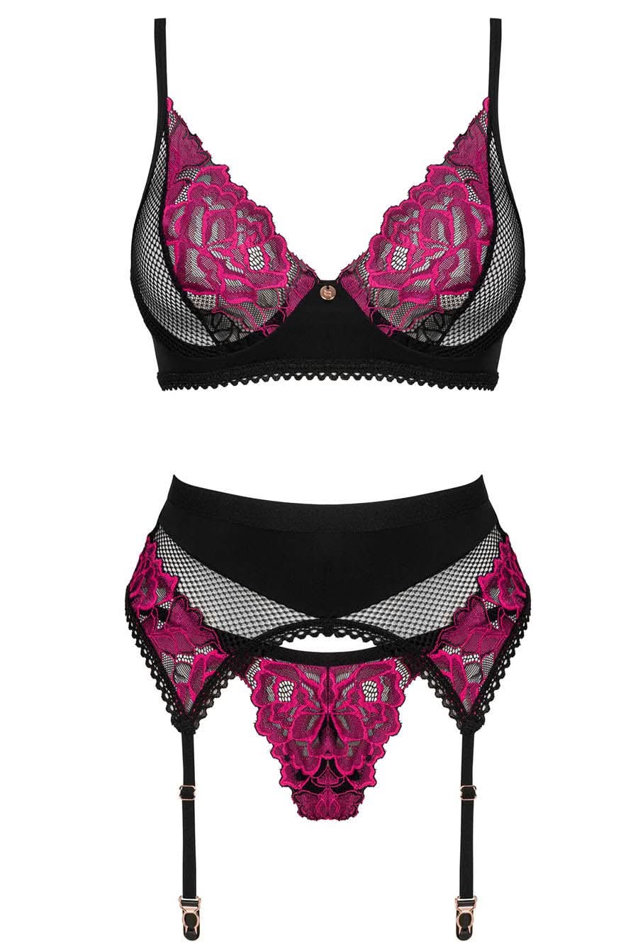 A sensual new design in pink and black in a classic design in a 3 piece bra, gstring and suspender belt set. Style features pink and black fishnet lace and micro knit in an underwire bra, gstring and suspender belt lingerie set.