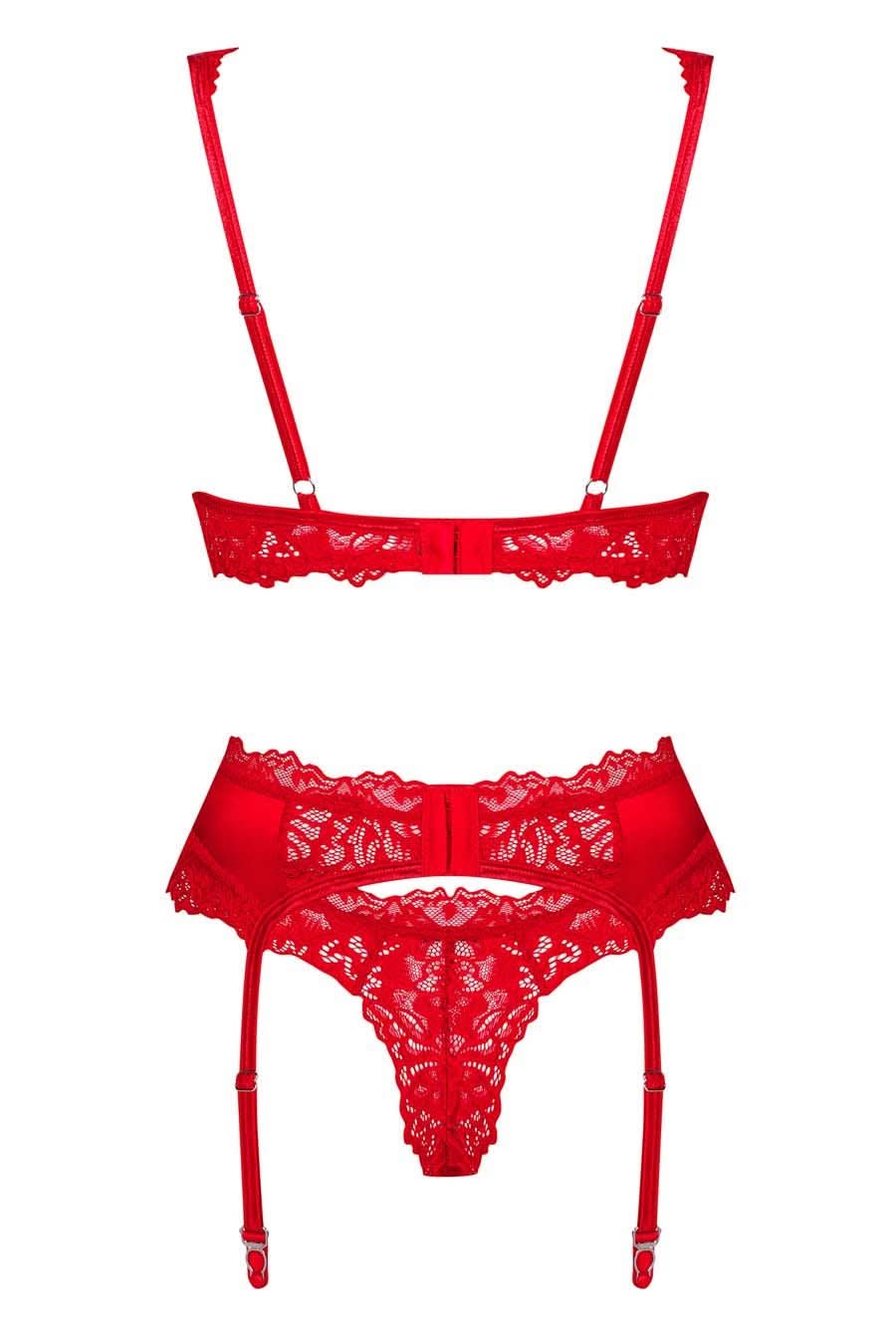 Prepare to dazzle this holiday season with our exquisite three-piece lingerie set, featuring a luxurious combination of red satin and intricate lace design. This alluring ensemble comprises an underwire bra, a matching G-string, and a beautifully crafted suspender belt, all designed to enhance your silhouette and provide a captivating look.