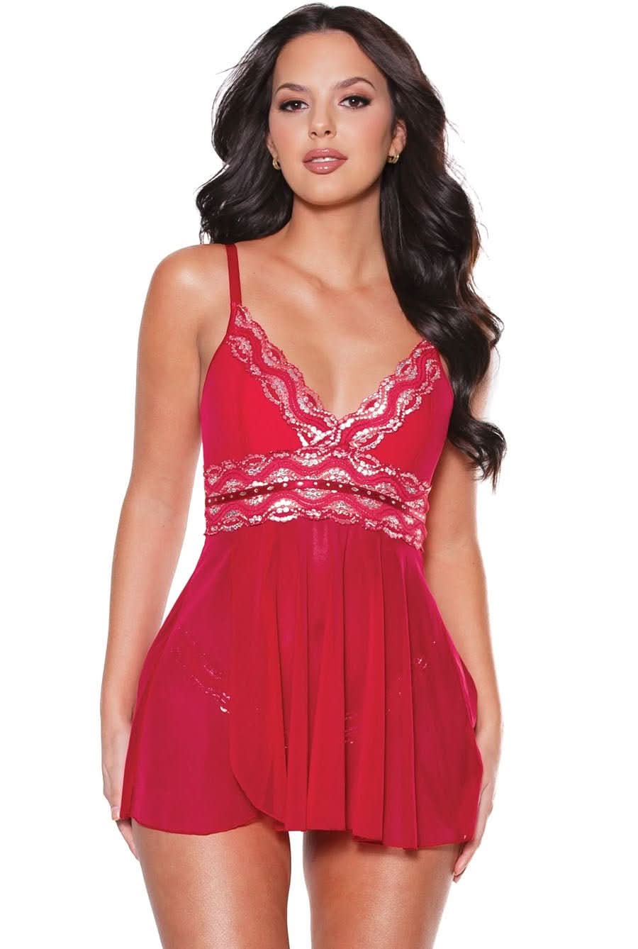 Red Mesh & Shimmer Lace Babydoll Sleepwear
