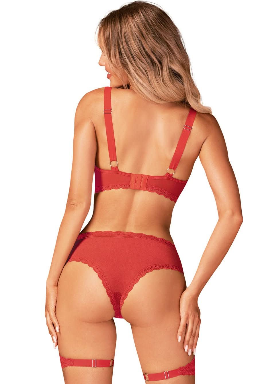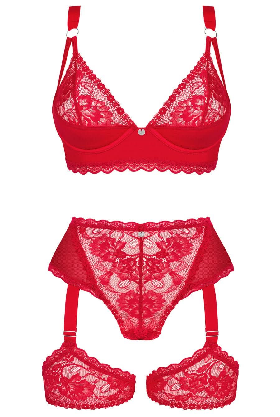 Discover an alluring new addition to your lingerie collection with this striking underwire bra set crafted from vibrant red microknit and delicate lace. The design features sheer lace cups complemented by a supportive bottom liner, a charming center accent, and enticing removable garter straps that enhance its seductive appeal.