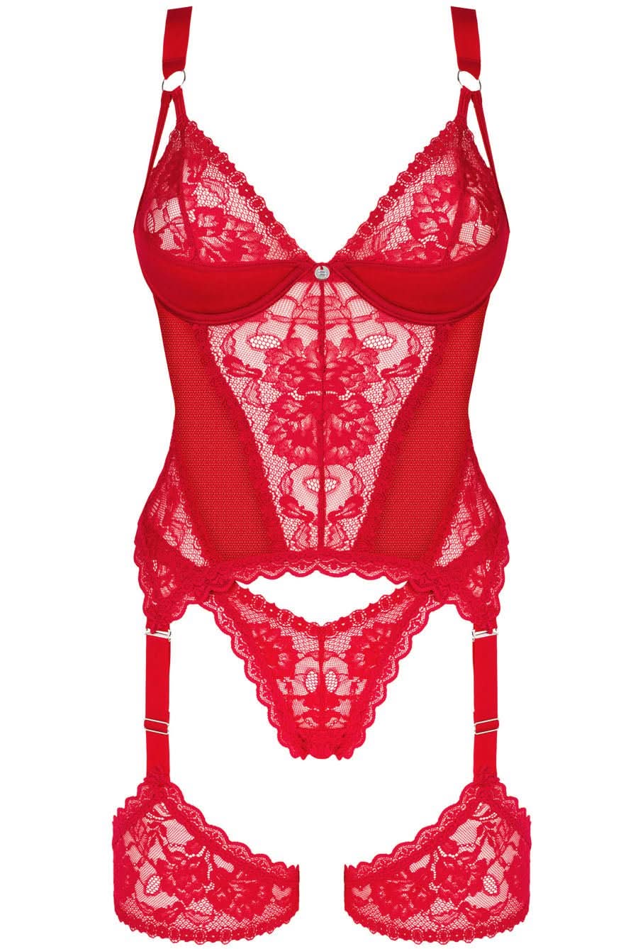 Explore a bold and alluring addition to your lingerie collection with our latest underwire corset, crafted from vibrant red microknit and intricate lace. This piece is designed to enhance your silhouette and provide a touch of elegance with its unique features.