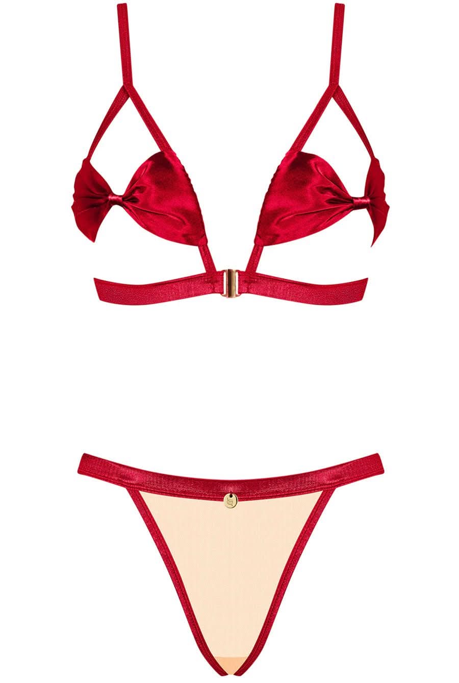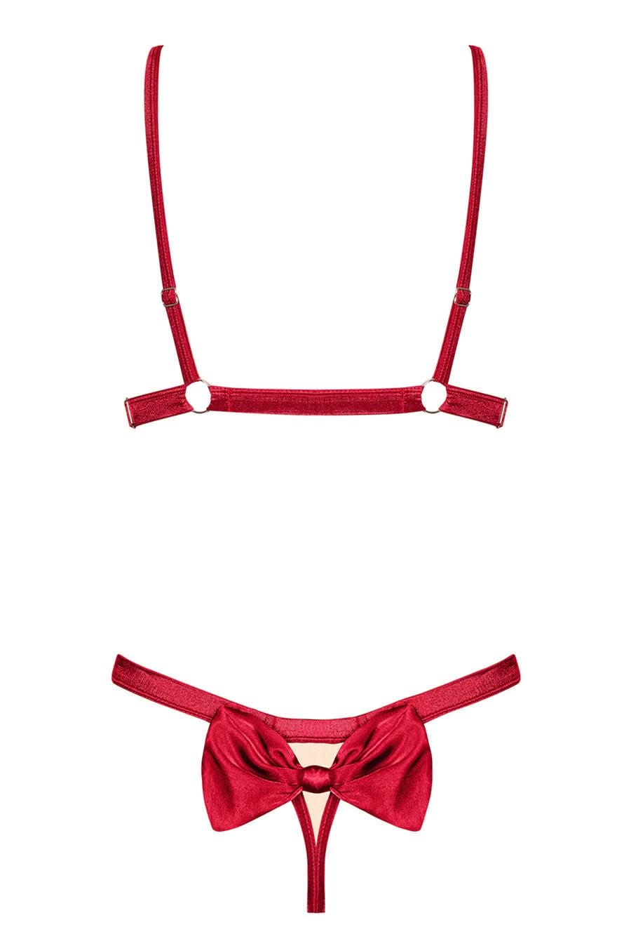 Elevate your evening with a striking red satin lingerie ensemble designed to make a lasting impression. Featuring an alluring open-cup bra, this set combines sensuality with elegance, making it an ideal choice for intimate occasions. The cheeky sheer nude bow g-string complements the bra perfectly, offering a playful touch that's sure to delight.