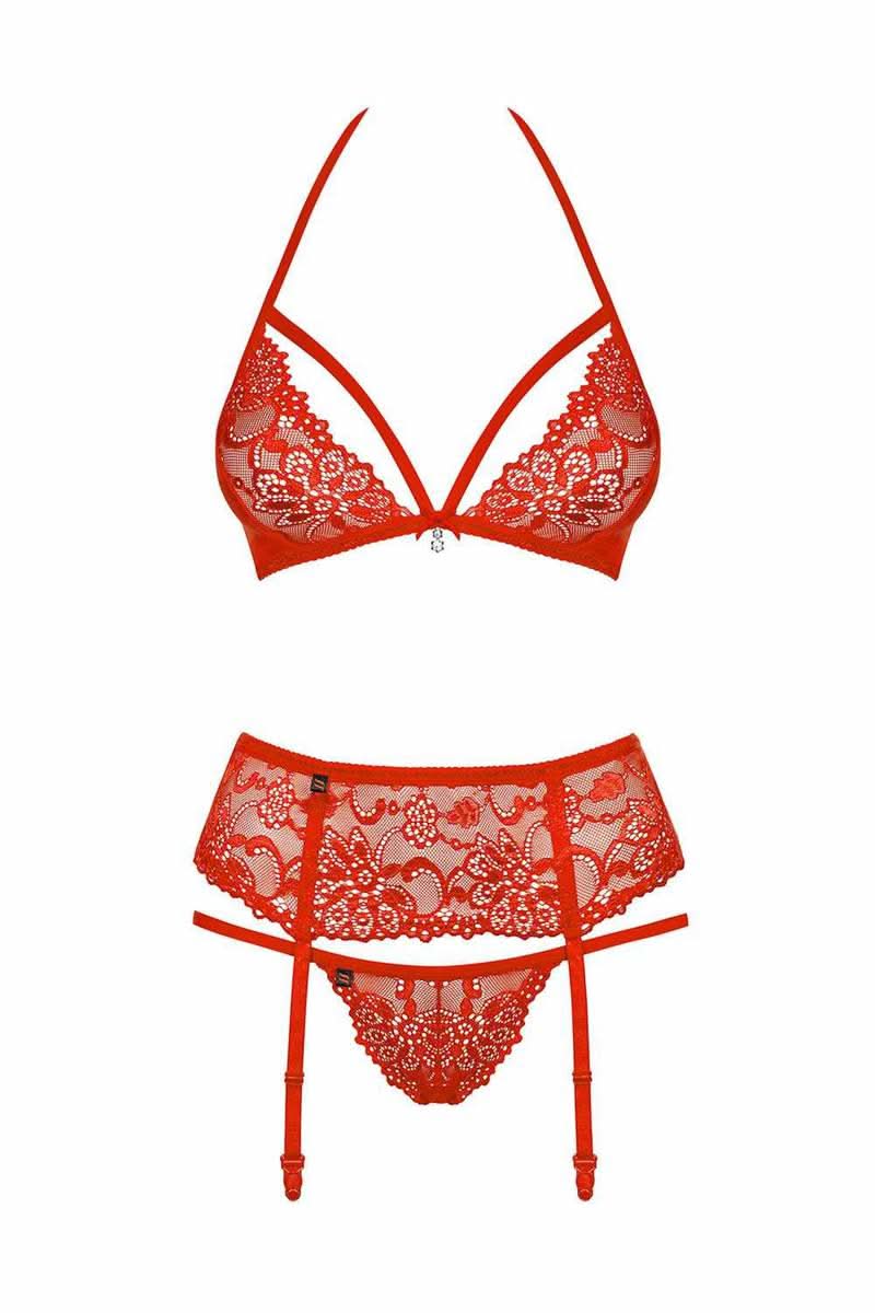 Unveil your inner confidence with this exquisite three-piece red lingerie set, designed to blend allure and comfort seamlessly. This collection includes a stylish tri bra, a delicate g-string, and a beautifully crafted garter belt, along with matching stockings available as an accessory.