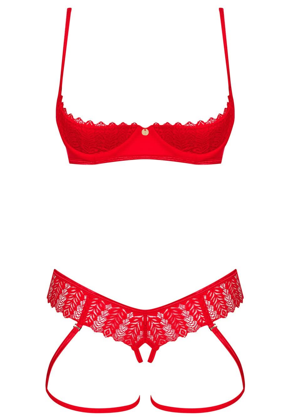 Erotic Red Lace Quarter Cup, Crotchless Bra Set